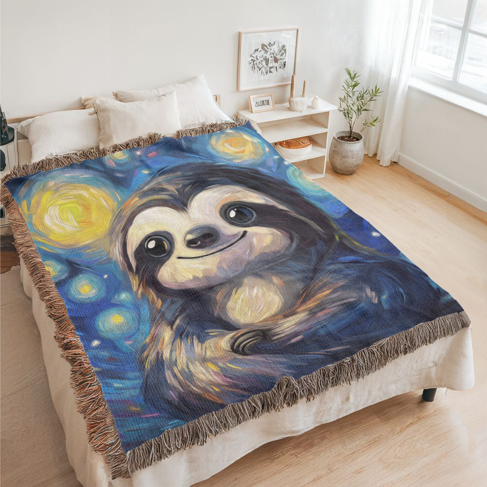 Starry Sloth Woven Blanket – Cozy Animal Art Decor with Whimsical Van Gogh Style